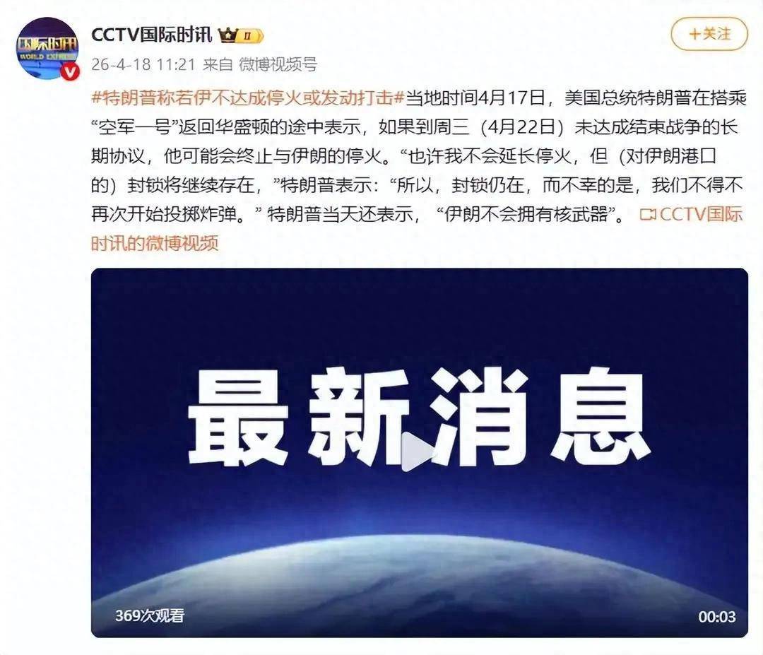 据CCTV国际时讯,当地时间4月17日,美国总统特朗普在搭乘“空军一号”返回华盛顿的途中表示,如果到周三(4月22日)未达成结束战争的长期协议,他可能会终止与伊朗的停火。“也许我不会延长停火,但(对伊朗港口的)封锁将继续存在,”特朗普表示:“所以,封锁仍在,而不幸的是,我们不得不再次开始投掷炸弹。” 特朗普当天还表示, “伊朗不会拥有核武器”。