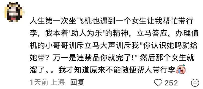 不少网友纷纷分享类似经历,有人称曾被值机员提醒:“你认识她吗?万一是违禁品你就完了!”也有网友建议机场循环播放警示广播。